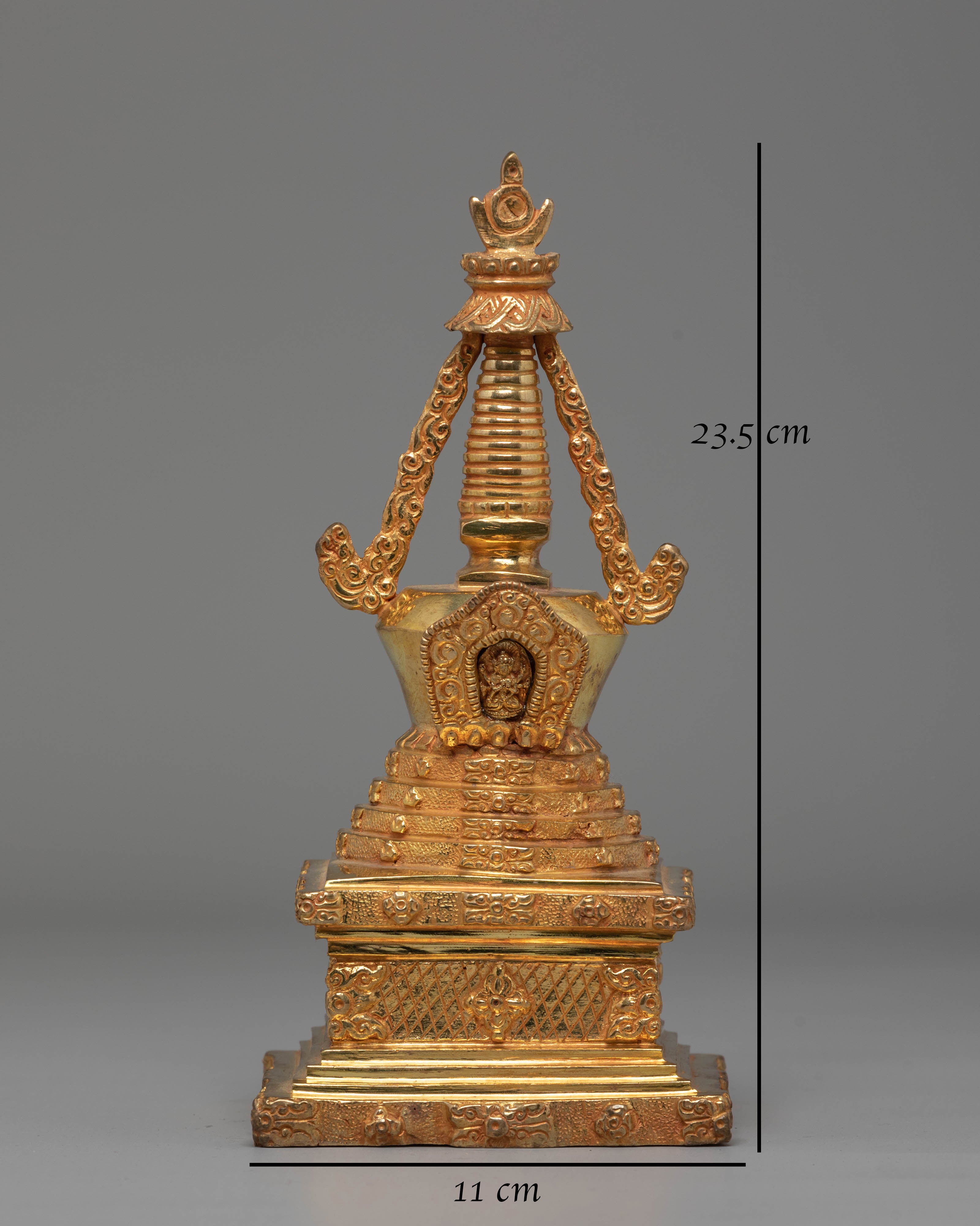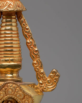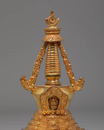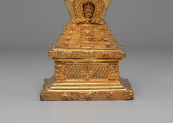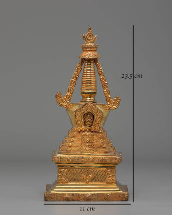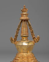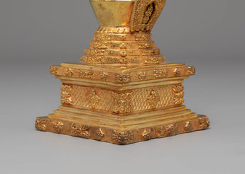 This Handcrafted Mahabouddha-Style Stupa is expertly made from a Copper Body with 24K Gold Plating, measuring 23cm in height and 10cm in width, with a solid weight of 0.72kg. Its refined craftsmanship highlights the intricate structure inspired by traditional sacred stupas found across the Himalayan region. Every detail—from the smooth dome to the ornate harmika—reflects authentic Buddhist artistry, making it a devotional centerpiece for both home shrines and spiritual collections.