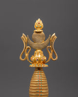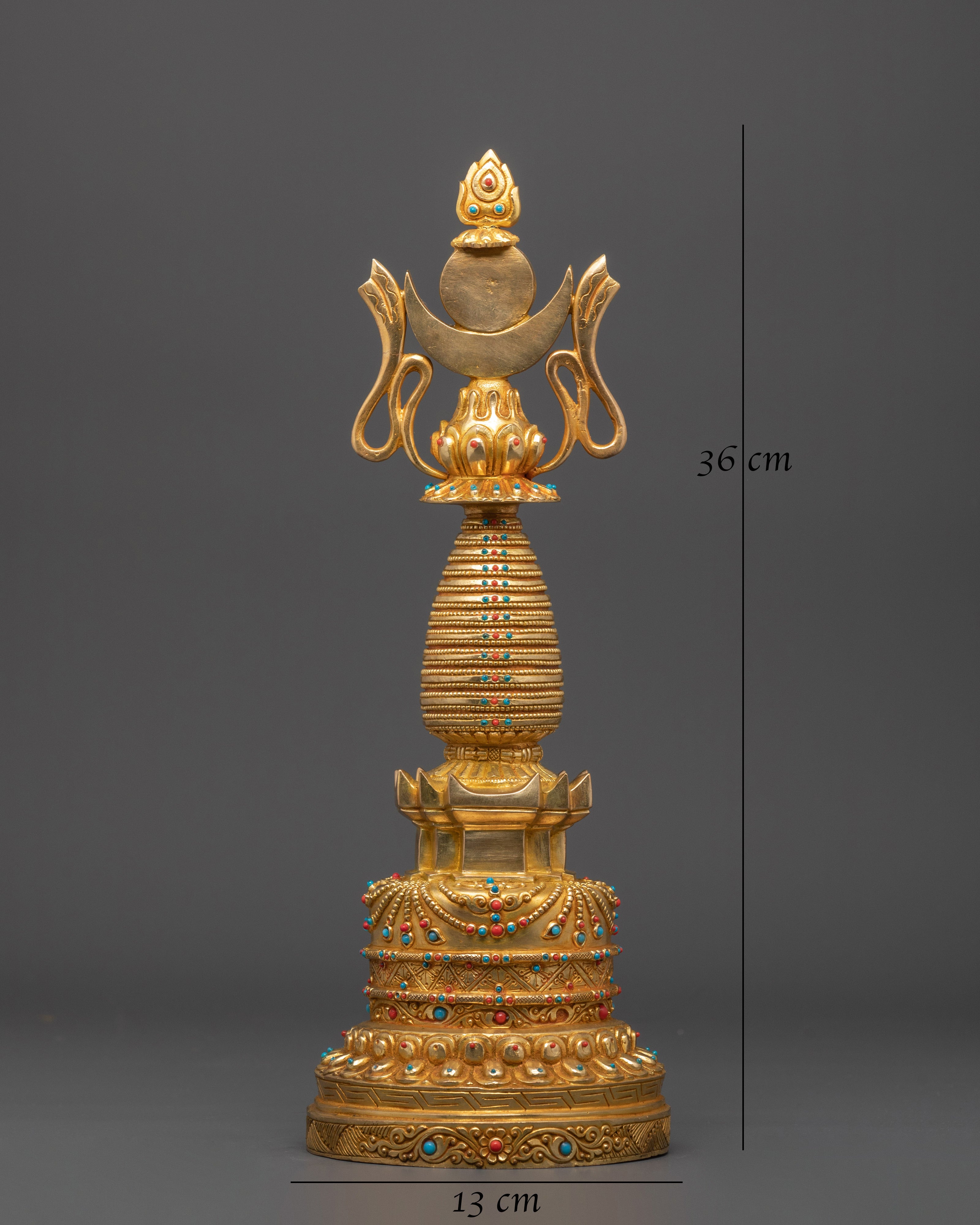 The Sacred Buddhist Copper Stupa measures 36cm in height and 13cm in breadth, weighs 1.86kg. This stupa, made of copper and plated in gold, is enhanced with artificial stones such as turquoise and coral, representing the union of wisdom, protection, and spiritual energy. The stupa is a key symbol in Tibetan Buddhism, representing enlightenment, spiritual protection, and the way to Nirvana. This gorgeous sculpture can be displayed on altars, meditation rooms, or sacred corners to enhance your spiritual practice while also providing protection, blessings, and a stronger connection to Buddhist teachings.