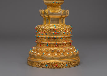 The Sacred Buddhist Copper Stupa is handcrafted with great detail and reflects traditional Tibetan design aspects, such as the tiered structure and symbolic patterns. The gold-plated finish reflects the stupa's holy aura, while the turquoise and coral accents offer a layer of spiritual significance, representing harmony, prosperity, and protection. This sculpture's presence on your altar or sacred place evokes feelings of tranquility and mindfulness, making it an ideal tool for strengthening meditation practice or creating a sacred environment in your home or temple.