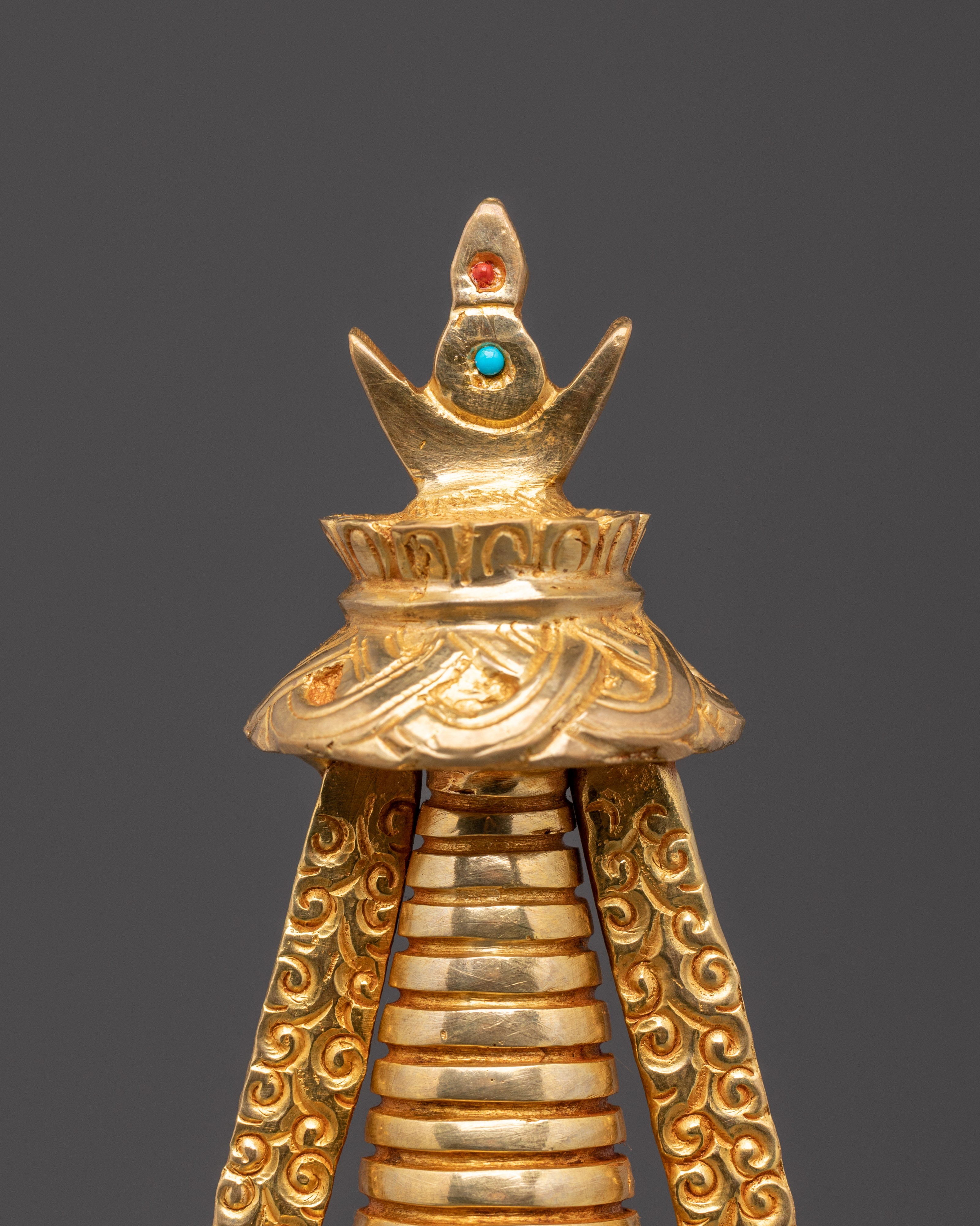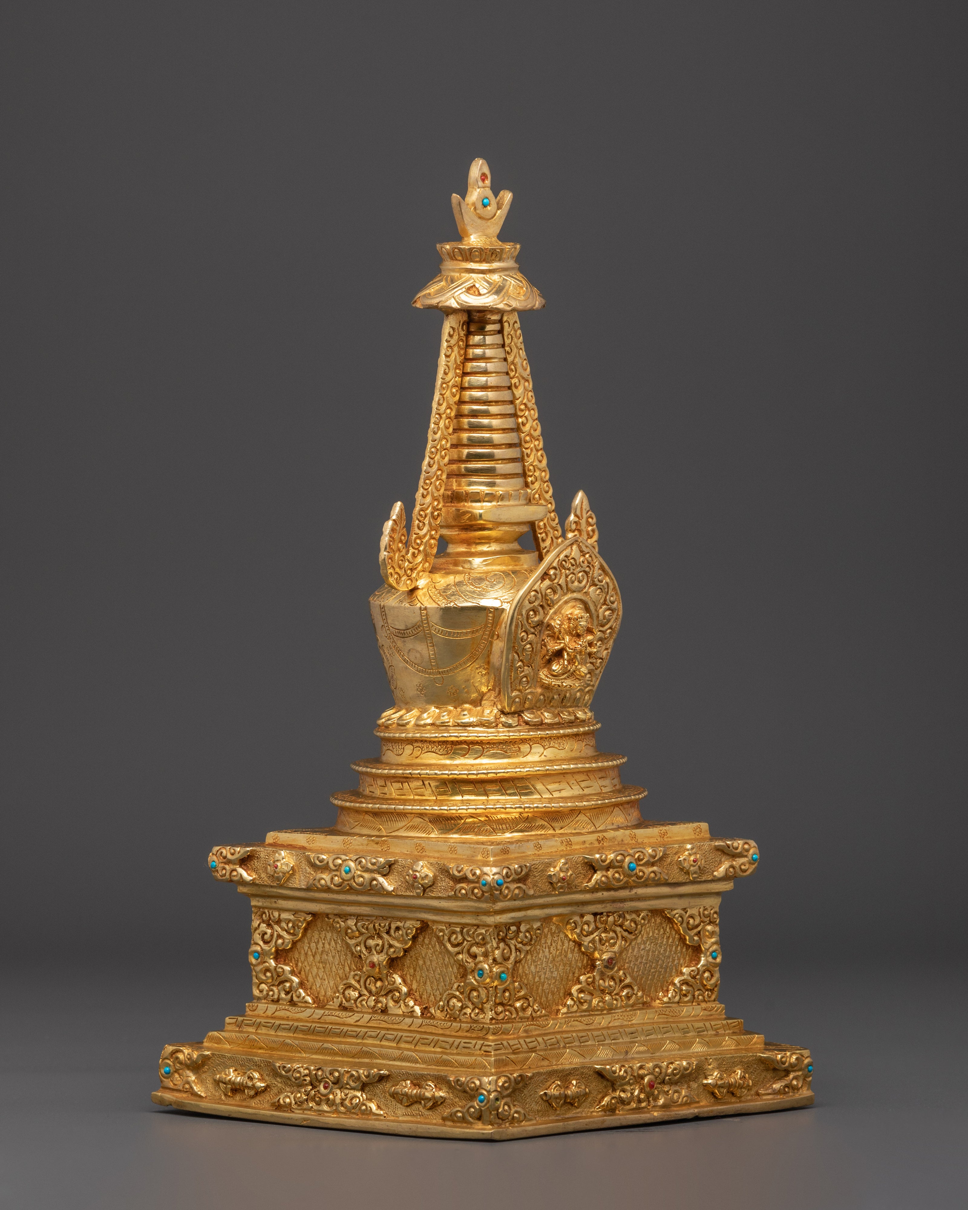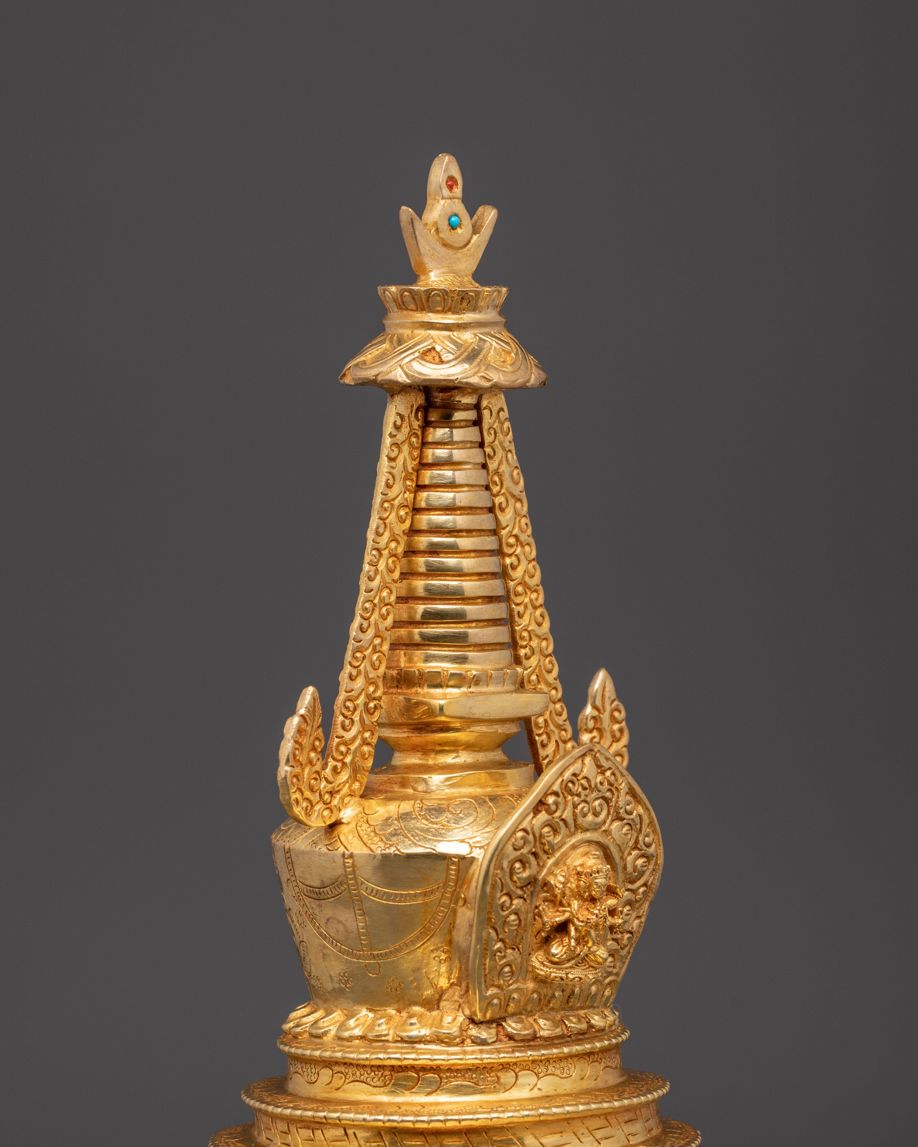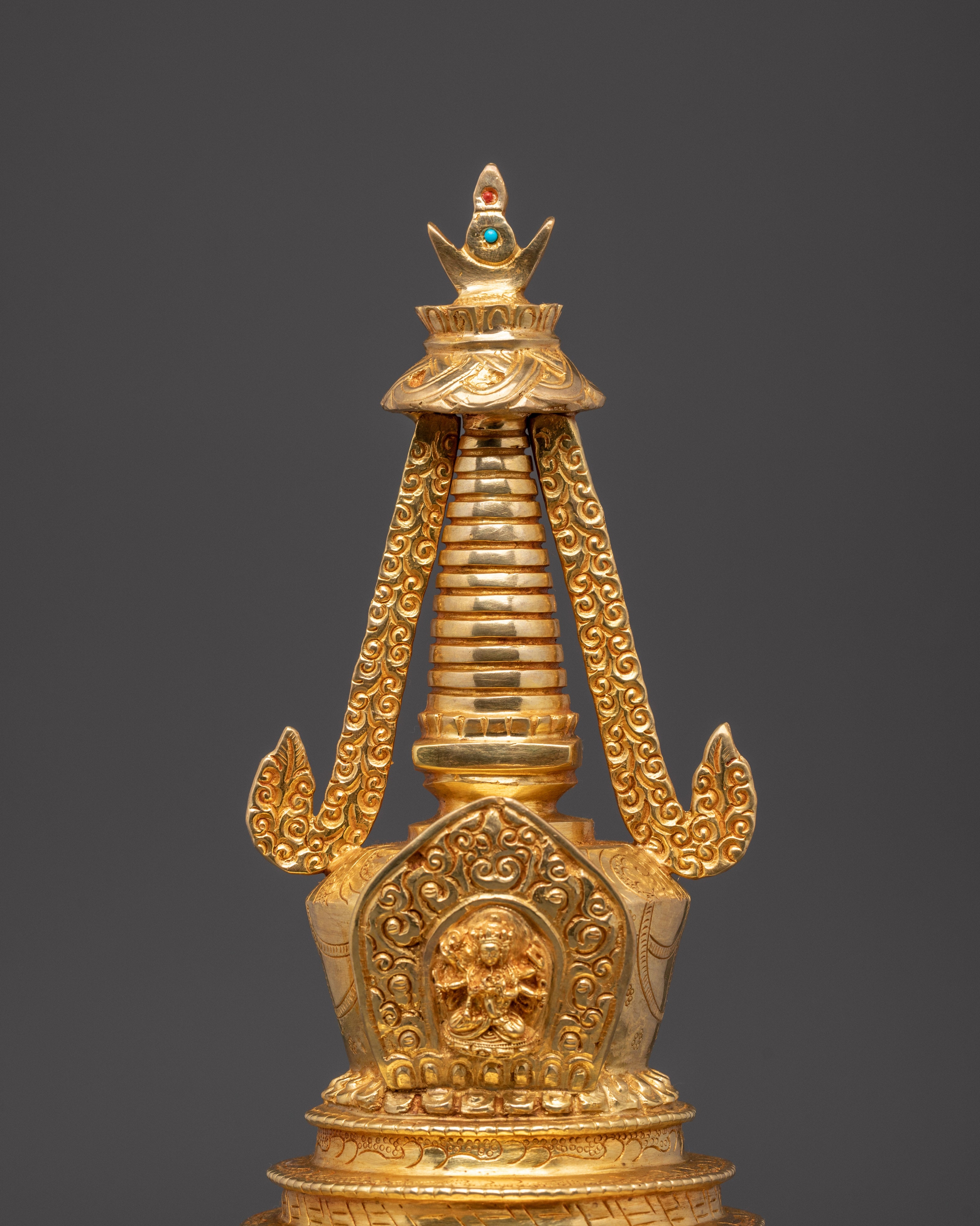 The intricate design of the stupa features a beautifully detailed figure of a deity at the center, surrounded by ornate patterns, reflecting the sacred and profound teachings of the Buddha. The gold-plated accents enhance the spiritual significance, symbolizing purity, enlightenment, and the triumph of wisdom over ignorance. The stupa’s placement in Buddhist altars, meditation rooms, or as part of a spiritual decor set, infuses the space with tranquility and energy.