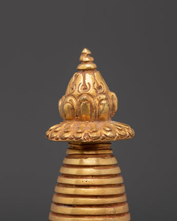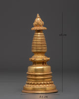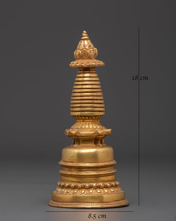 The Sacred Tibetan Altar Stupa is a strong symbol of enlightenment and spiritual devotion in Buddhist culture. Standing 18cm tall, 8.5cm wide, and weighing 0.53kg, this precious item is handcrafted from copper and exquisitely polished with gold plating. The stupa, traditionally found on home altars and temples, depicts the Buddha's mind and serves as a focal point for meditation, prayer, and offerings.