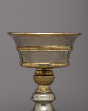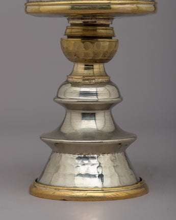 Our Brass Oil Lamp is exquisitely constructed and a monument to the skill and devotion of ancient traditions. It is handcrafted with meticulous care to detail and boasts a white metal base embellished with brass top and bottom rings, giving it a timeless appeal. Standing 16cm tall, this lamp captures the essence of holy rites and spiritual practices.