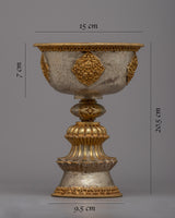 This exquisite Butter Lamp Offering Prayer Set, carefully handcrafted on a copper body and embellished with a gleaming silver-plated finish, will help you establish a sacred environment and pay homage to the divine. The collection of butter lamps, which weighs a total of 1.45 kg, represents the giving of light, understanding, and compassion to enlightened beings. Let the gentle glow of these holy lamps illuminate your spiritual practice and lead you along the road to piety and spiritual development. With the help of this beautiful prayer set, embrace the age-old practices of Tibetan Buddhism and strengthen your connection to the divine while filling your surroundings with blessings and uplifting energies.