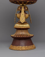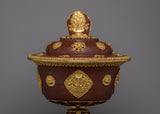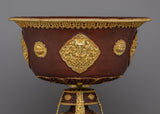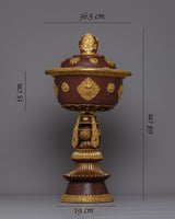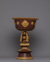 The butter lamp is a magnificent work of art that is both beautiful and functional, with a copper body, 24k gold plated, and auspicious symbol crafted. The lamp is intended to house a traditional butter candle, which creates a warm and welcoming atmosphere in temples and homes. The unique design of this lamp allows it to be dismantled into different pieces for easy storage and transportation. This feature makes it an appealing option for those who frequently travel or have limited storage space. The 24k gold plating and auspicious symbols add a touch of elegance and spiritual significance to this butter lamp, making it a must-have for any devout Buddhist practitioner or fine art collector.