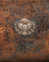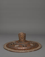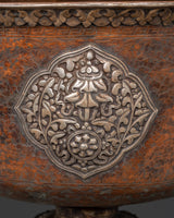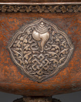 These enormous, beautifully constructed butter lamps offer light, symbolizing the removal of darkness, ignorance, and negativity while welcoming wisdom, clarity, and enlightenment. The offering symbols and flower carvings on the base are silver, but the entire butter lamp is copper-crafted. The butter lamp features a long-life vase with a Kirtimukha in the center, surrounded by flowing silver-carved motifs.