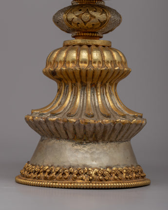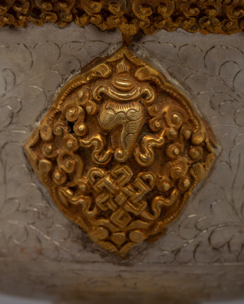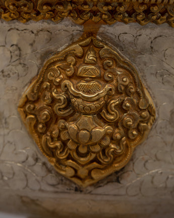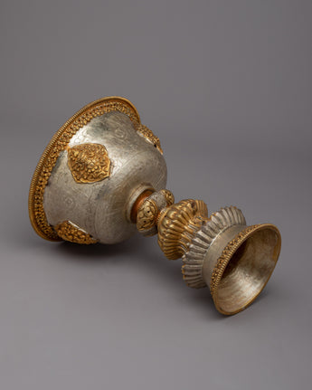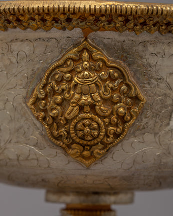 Illuminate your sacred space with the divine radiance of the Traditional Copper Butter Lamp. Expertly handcrafted on a copper body, this exquisite lamp is adorned with intricate auspicious symbols, lovingly carved to evoke blessings and positivity. The lamp is further elevated with a silver-plated finish, adding a touch of elegance to its already divine charm. Light up your prayers, offerings, and meditative moments with this captivating and spiritually significant piece.