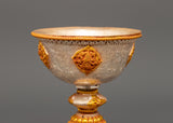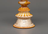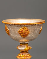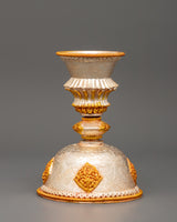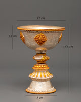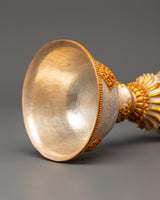 This 0.36kg butter lamp is made of high-quality copper and plated in gold and silver, giving it an air of elegance and spiritual importance. The 12cm diameter produces a steady, bright blaze, while the 8cm base provides stability. Its 5.5cm-deep inner chamber is great for storing butter, ghee, or oil, making it an excellent instrument for daily offerings, meditation, and ceremonies. This elegant butter lamp is a strong symbol of enlightenment and devotion, whether used in personal rituals or at temples.