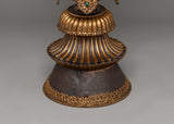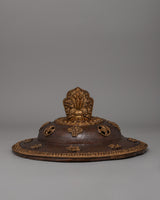 The Copper-made Butter Lamp is a beautifully crafted ritual item measuring 63 cm in height and 20 cm in width. Made primarily of copper, it features intricate gold plating, enhancing its visual appeal and adding a sense of opulence. At the top of the lamp is an offering symbol, an essential element in many Tibetan rituals, signifying a connection to the divine. The double vajra carved on the cap further adds to its spiritual significance, representing the indestructibility and purity of the dharma.