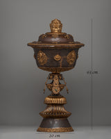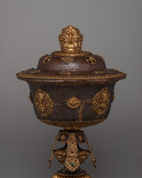 As you move down the lamp, auspicious symbols are carved into the sides of the butter lamp's head, reinforcing its role in promoting good fortune and blessings. Below the head, a long-life vase is depicted with deeply engraved carvings, symbolizing the wish for longevity and the preservation of health. The intricate carvings on the vase add beauty and meaning to the piece. These elements are significant in Tibetan Buddhist culture, where longevity and prosperity are often sought through symbolic offerings.