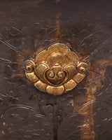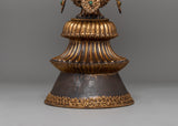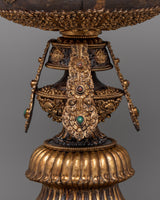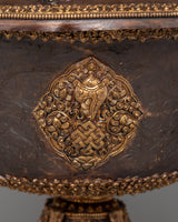 The floral carvings at the base of the butter lamp showcase the skill of the artisans who crafted it. The base itself is elegantly designed, and the floral motif represents purity, harmony, and the blossoming of spiritual wisdom. The combination of copper, gold plating, and finely detailed carvings makes this butter lamp a functional object for ritual offerings and a unique work of art. Its spiritual symbolism, combined with the artistic craftsmanship, makes it a centerpiece for any altar or sacred space.