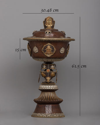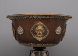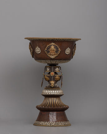 Butter lamps are an essential element in the offering practices of Tibetan Buddhism and represent the offering of light to enlightened beings. Butter lamps are called “the Dharma light.” Their form is reminiscent of the Christian chalice, and they would have been used on an altar, filled to the brim with yak butter oil and a single wick floating in each.