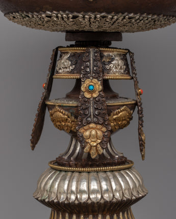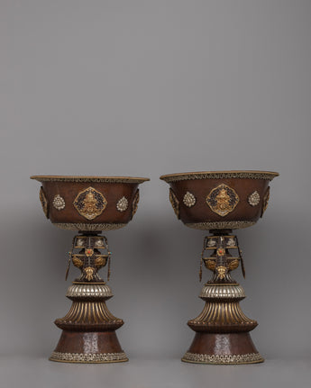 With our gorgeous Copper Oil Lamp Set, you may enhance your spiritual practice and beautify your sacred place. Crafted with great care and attention to detail on copper bodies and lavishly plated in gold and silver, these lamps radiate a sense of ageless refinement and respect. This pair of lanterns, together weighing 10.3 kg, is a representation of both spiritual and divine riches.