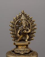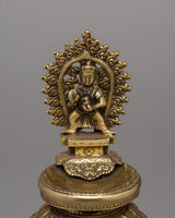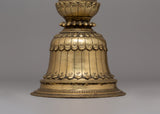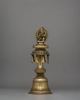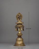 This pair of Panas lights is intended to be spiritually meaningful and artistically appealing. The upper half features a deity seated beneath a richly decorated arch, symbolizing heavenly benefits and protection. Delicate brass tassels beneath the god lend an artistic touch, softly swinging and complementing the exquisite design of the lights. The more extensive base provides stability, while the lotus-inspired motifs represent purity and enlightenment. These aspects combine to form an item that both illuminates and inspires veneration.