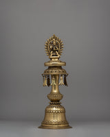 The Decorative Panas Lamp Set is a pair of finely handmade brass oil lamps. Each lamp is 44.5 cm tall, 16.5 cm wide, and a total weight of 5.11 kg, demonstrating its craftsmanship. The lamps blend usefulness and aesthetic appeal, evoking traditional artistry as attractive decor items. Their design includes elegantly carved decorations on the base and stems, culminating in a sculpted deity figure at the top, making them suitable for ceremonial or ornamental use.