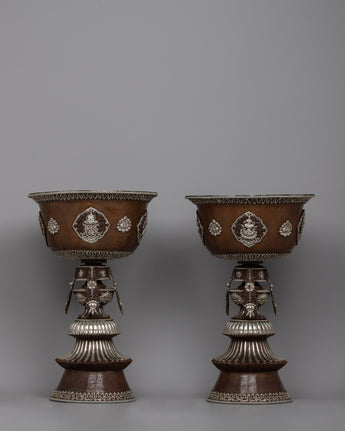 Enjoy the charming atmosphere that these lamps' delicate, shimmering light creates as it fills your house or shrine with a cozy, welcoming glow. Whether it is utilized for ceremonial offerings, meditation exercises, or daily rituals, our Ghee Butter Lamp Set acts as a hallowed focal point, enhancing the spiritual ambiance and encouraging times of reflection and reverence. With these beautiful lamps, you may embrace the transformational power of light and express your dedication to enlightenment and spiritual development.