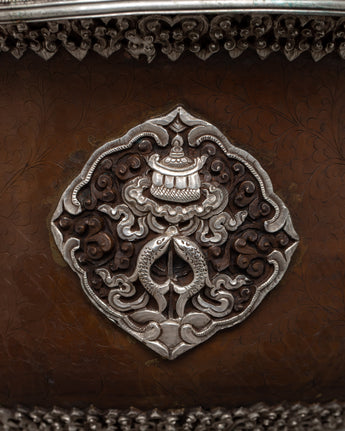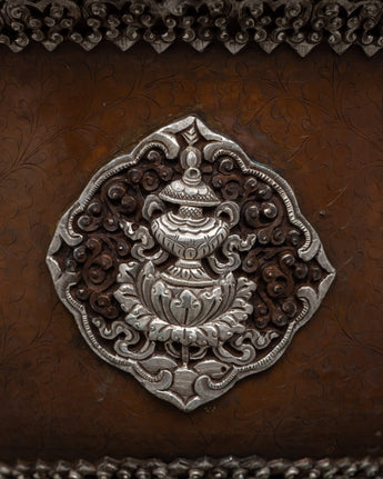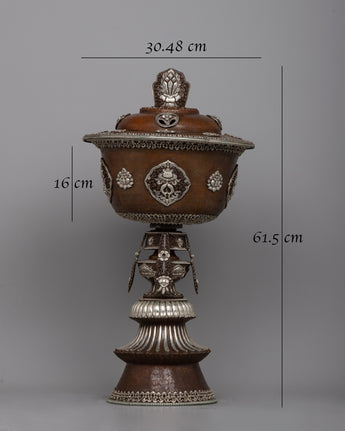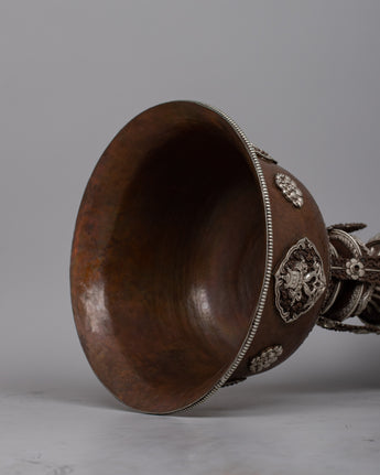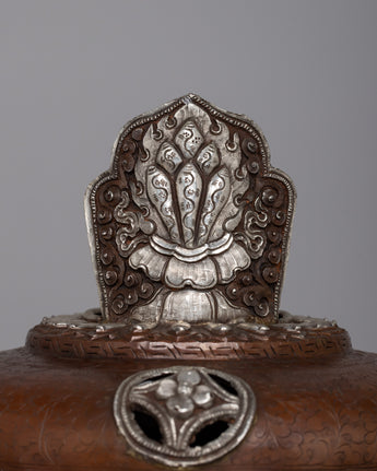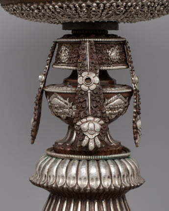 With the unmatched grace and spiritual resonance of our Ghee Butter Lamp Set, light up your sacred place. These lamps, which are meticulously crafted on copper bodies and beautifully silver-plated, exude an enduring beauty that surpasses everyday life. This pair of lights, weighing a total of 10.03 kg, is evidence of the skillful craftsmanship and passion that go into each piece.