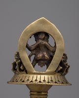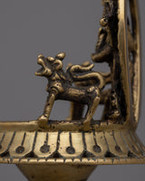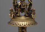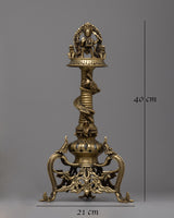 The lamp's brass body, which was crafted with care and precision, displays exquisite workmanship and conventional artistry. Adding Kartikeya, who represents bravery, strength, and protection, lends a hint of spiritual importance.