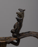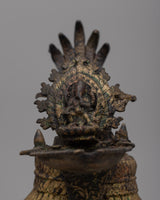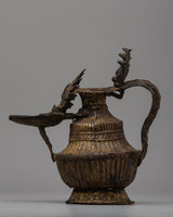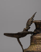With this intriguing antique from the Malla era, the Antique Newari Sukunda, you may fully immerse yourself in the rich tapestry of Nepalese history and heritage. This lamp, with its meticulously crafted copper body, evokes a bygone era of artistic perfection with its timeless elegance and craftsmanship. With its 24cm height, it is not only a historical artifact but also a representation of spirituality and tradition, providing insight into the diverse cultural practices of the Newar people.