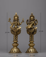Experience the elegance and cultural significance of this handcrafted brass Saraswoti and Laxmi Oil Lamp Set. This set includes two beautiful oil lamps, each measuring 30 cm in height and weighs 2.88 kg in total.