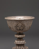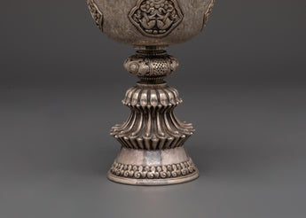 The silver butter lamp, which is typically used with clarified butter or oil, is a crucial component of Tibetan offerings and Buddhist prayer rites. The soft flame is a potent instrument for increasing spiritual attention and awareness, as it symbolizes the light of knowledge dispelling the darkness of ignorance. Its exquisitely carved silver body reflects light, adding to the hallowed atmosphere of your home altar, temple, or meditation area.