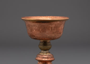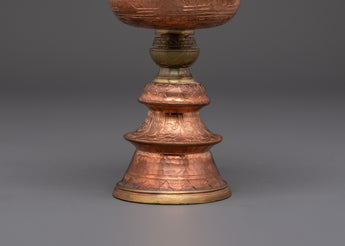 The copper body is enriched with finely engraved motifs that include lotus-inspired designs and auspicious patterns, each representing purity, enlightenment, and spiritual growth. The brass accents highlight the artistry and bring depth to the layered base, which rises elegantly to support the 5 cm deep bowl. Every detail reflects Himalayan craftsmanship and the cultural traditions of Tibetan Buddhist ritual art.