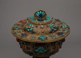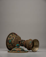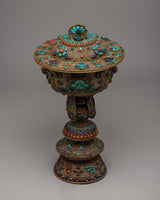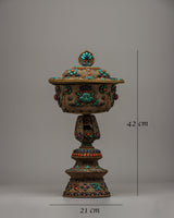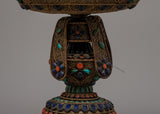 With this exquisitely designed Butter Lamp Set, you can fill your sacred area with a soft, elegant glow that will fill the air with peace and grace. These lamps, which are handcrafted with a copper body and a shiny silver finish, radiate sophistication and ageless elegance. Semi-precious turquoise, coral, and lapis lazuli stones are painstakingly inlaid into each lamp to accentuate their aesthetic appeal and spiritual value.