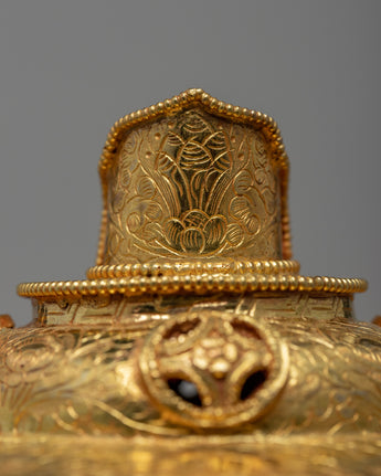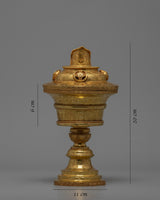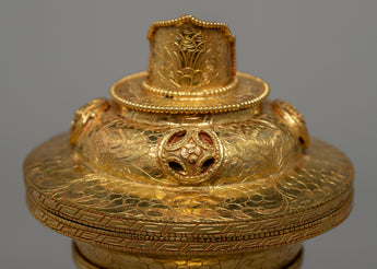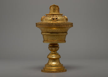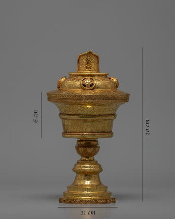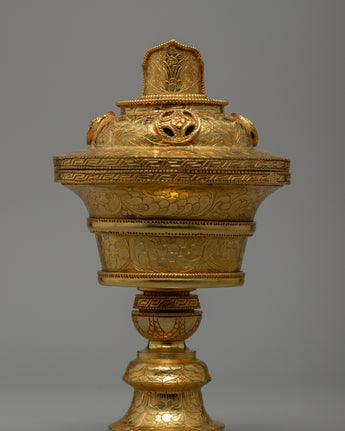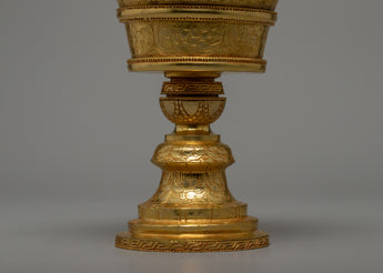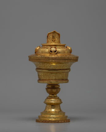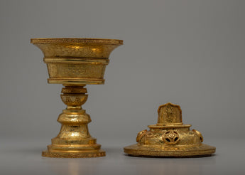 Our butter lamp is a copper lamp with gold plated. The floral design is carved on the lamp. The lid helps to protect the flame from the air and can easily be separated to refill the butter or oil. It is also engraved with different decorations to make it look more elegant.