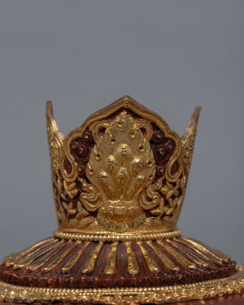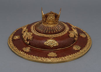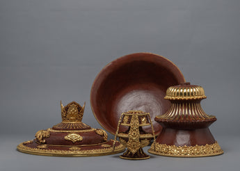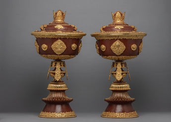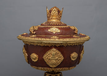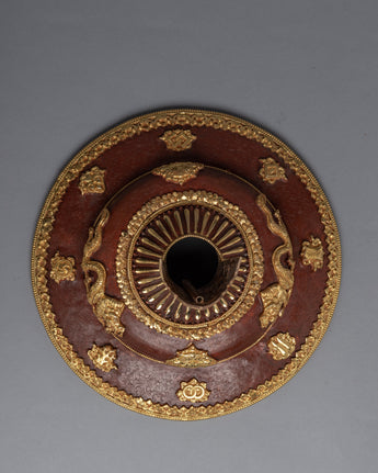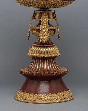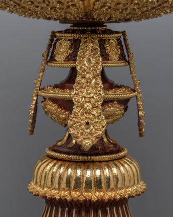 The butter lamp set with a copper body is a lovely and functional piece of art that was handcrafted with meticulous care and attention to detail. The lamp has been plated in 24k gold, giving it a stunning, luxurious look that is sure to impress. In addition, the lamp is adorned with auspicious symbols that are believed to bring good luck and positive energy into the home. The beautiful design of this lamp, which allows it to be dismantled into different pieces, adds to its uniqueness. This not only simplifies cleaning and maintenance but also expands its versatility and functionality.