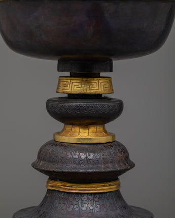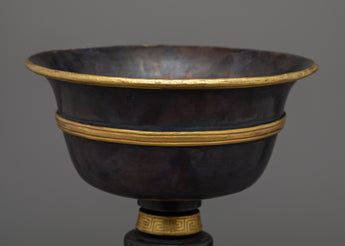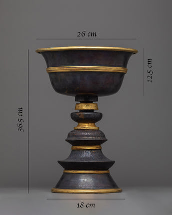 Tibetan Butter Lamps, which are skillfully constructed on oxidized copper bodies and embellished with rich gold plating, will illuminate your sacred area with timeless elegance. Each lamp radiates a sense of calm and reverence, representing the eternal light of wisdom and compassion in Tibetan Buddhist traditions. With a total weight of 10 kg, this set of butter lamps represents both spiritual significance and excellent craftsmanship, making it a treasured addition to any shrine or meditation altar.
