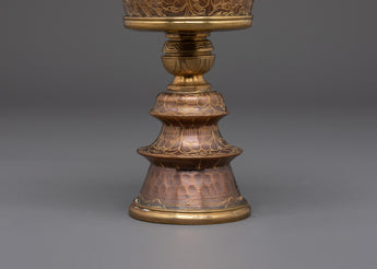 The copper body is accented with brass detailing and engraved with delicate flower motifs that flow around the surface. These designs reflect purity, growth, and spiritual awakening, echoing the lotus and other sacred floral symbols often found in Himalayan art. The 5 cm deep bowl rests above a layered base, each section carefully shaped and patterned to highlight traditional craftsmanship and symbolic artistry.