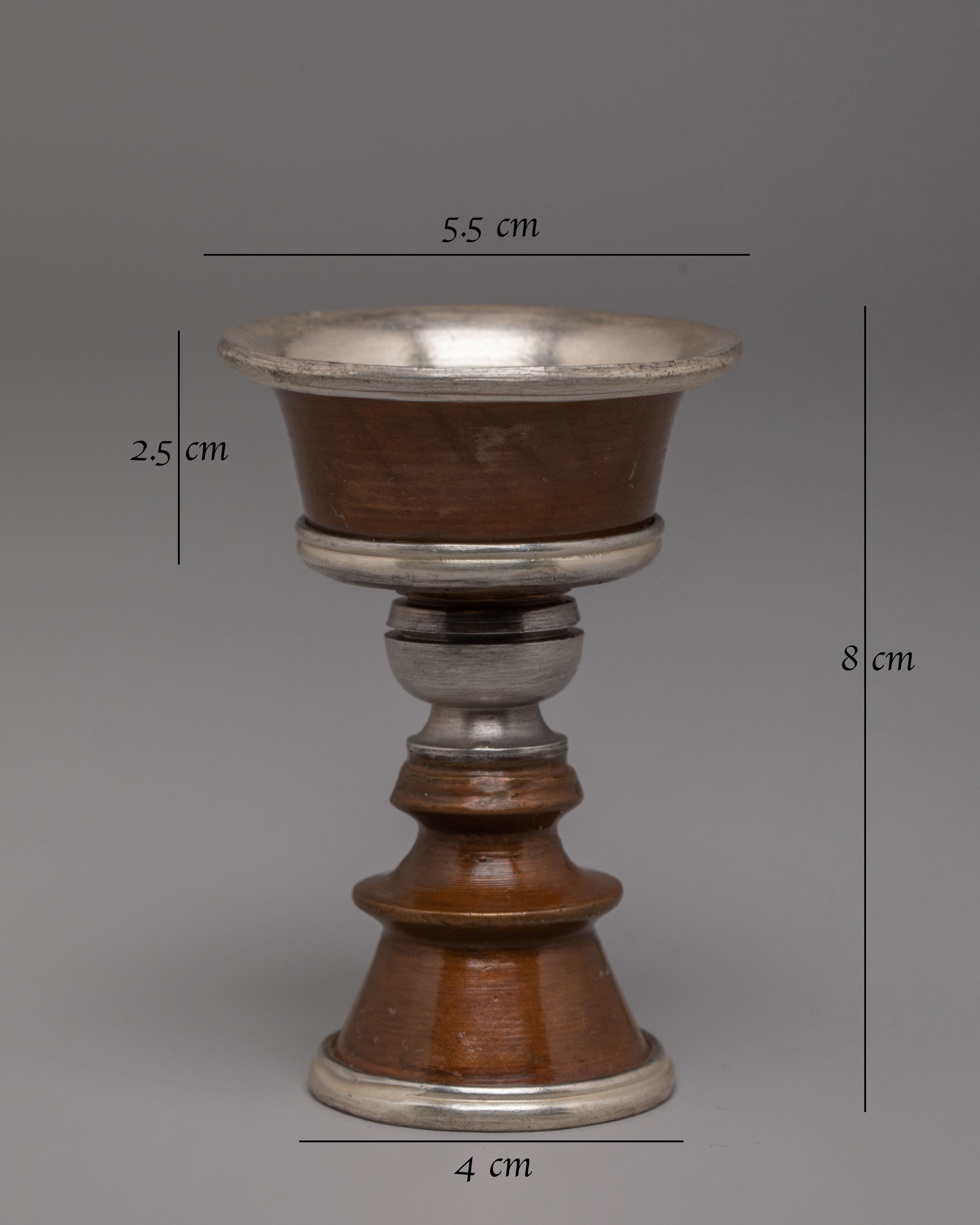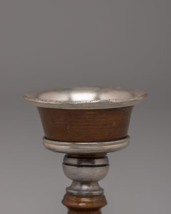 The design of the Butter Lamp features a classic shape, with the deep bowl at the top intended to hold clarified butter or oil for lighting. The oxidized copper body gives the lamp a rich, earthy tone, while the silver-plated accents add a refined touch, signifying purity and spiritual energy. The inner depth of 2.5 cm is designed to hold the lamp's oil, while the lamp's overall aesthetic conveys a delicate balance between simplicity and sacred beauty, making it perfect for Buddhist rituals, meditation, and daily offerings.