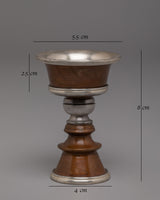 The Oxidized Copper Butter Lamp for Offering is a finely constructed and spiritually significant artifact that has long been utilized in Tibetan Buddhist rituals and ceremonies. This lamp stands 8 cm tall, has a diameter of 5.5 cm, and a base of 4 cm. It is made of oxidized copper with silver plating around the rim and base. This butter lamp, weighing 0.104 kg, serves as a beautiful and significant offering vessel in Buddhist practices, representing light, enlightenment, and the gift of wisdom and compassion.