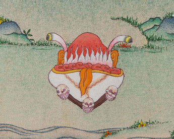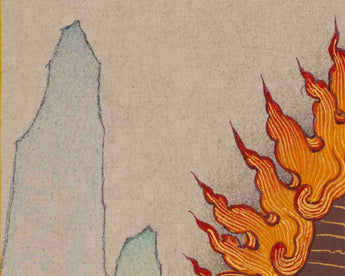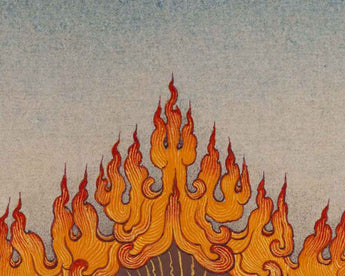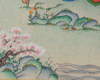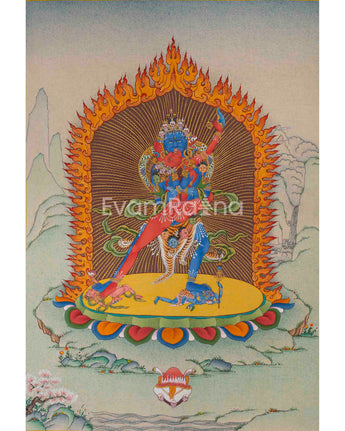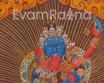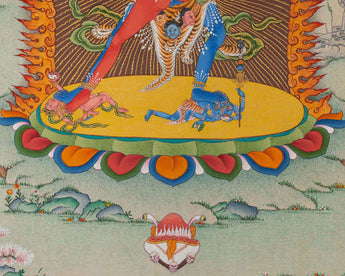 The Chakrasamvara Thangka serves as a masterful expression of the profound tenets of Vajrayana Buddhism, encapsulating the harmonious union of wisdom and compassion. Crafted with meticulous care on robust cotton canvas, this exquisite thangka portrays Chakrasamvara in vibrant natural stone colors, enriched by the opulent sheen of Genuine 24K Gold. The Karma Gardi style's intricate detailing breathes life into the dynamic and potent form of Chakrasamvara, symbolizing the transcendence of ordinary experiences into spiritual awakening. Beyond being a marvel of artistic expression, this thangka functions as a spiritual tool that inspires practitioners in their meditation endeavors, facilitating the exploration of deeper realms of consciousness and understanding. The adept craftsmanship of Nepalese artisans is evident in every facet of the thangka, rendering it a compelling addition to any space dedicated to spiritual growth and contemplation.