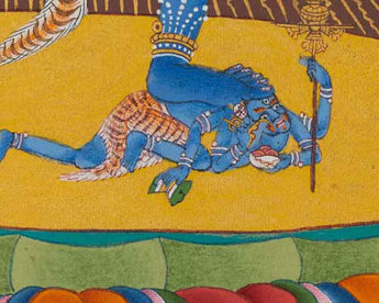 Chakrasamvara stands as a central figure in Tantric Buddhism, embodying the intricate fusion of bliss and emptiness, symbolizing the seamless union of wisdom and method. Often depicted in a visage that balances wrathful intensity with compassionate grace, Chakrasamvara serves as a profound representation of the transformative journey from desire to enlightened wisdom, triumphing over the obstacles posed by the ego. This portrayal underscores the core tenets of Tantric philosophy, emphasizing the practitioner's engagement with and transmutation of potent energies within their experience as a transformative path towards spiritual realization and ultimate liberation.