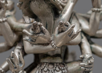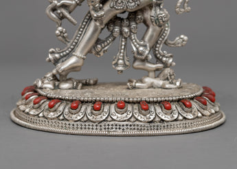 This 12 Armed Chakrasamvara Statue with Consort is machine-made. This Chakrasamvara statue depicts a deity on top of a sun disc lotus seat embracing his consort in a dancing position. The red stone is used on the base of the statue. Chakrasamvara is portrayed with four faces along with 12 hands that hold different Buddhist auspicious symbolic elements. His hands are crossed in the embracing mudra, and the vajra and bell, representing united happiness and nothingness, are held in his hands.