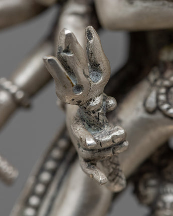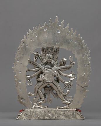 Chakrasamvara is the principal meditational deity of the mother tantras. He appears to be standing on a sun disc, encircled by a fiery aura of his luminous understanding. His hands are crossed in the embracing mudra, and the vajra and bell, representing united happiness and nothingness, are held in his hands. In the way of an ascetic yogi, he wears a tiger skin garment. The third eye of wisdom is on his forehead, and his countenance blends rage and passion.