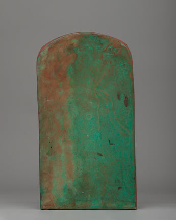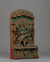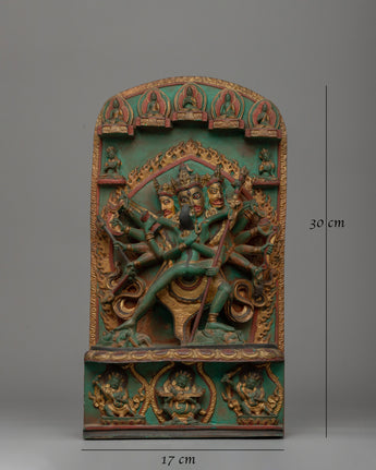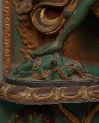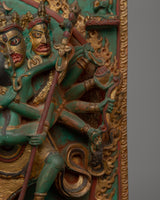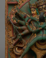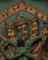 Chakrasambhara, the primary deity, is depicted in the statue's center with a powerful and commanding presence. His green skin represents vitality and the transformative power of nature. The deity's numerous arms carry symbolic items, emphasizing his role in spiritual and physical transformation. His face expresses a mix of fierceness and serenity, symbolizing his ability to overcome obstacles. The statue's fine detailing on his crown and attire gives it a divine aura, while the motifs at the base represent purity. This painting is a masterful depiction of spiritual strength, protection, and wisdom.