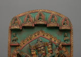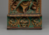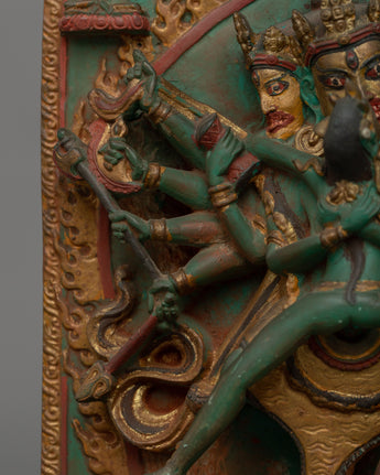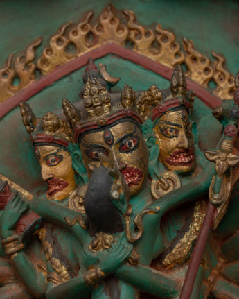 The Chakrasambhara statue is a magnificent example of Tibetan Buddhist art, meticulously crafted from resin and painted in acrylic colors. At the top of the piece, five Dhyani Buddhas are delicately carved with a throne and halo, each seated in a meditative posture representing wisdom and divine protection. These serene figures create a spiritual atmosphere that balances the central deity's fierce energy. The statue's base depicts three Mahakala figures, protector deities known for their fierce and transformative qualities. The Mahakalas are depicted in dynamic poses, emphasizing their protective role in warding off opposing forces and encouraging spiritual transformation.