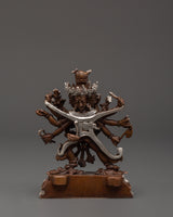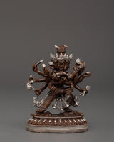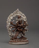 Chakrasambhara is often depicted as a powerful figure in Tantric Buddhism, symbolizing the union of wisdom and method to attain enlightenment. The oxidized copper body gives the statue an earthy feel, while the silver plating represents the purity and divine essence of the deity.