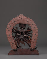 The statue, made of oxidized copper and enhanced with hand-painted acrylic color, is 22 centimeters tall, 17 centimeters broad, and weighs 0.89 kilos. Its brilliant details and blazing aura convey a sense of presence and devotion, making it ideal for an altar setting or focused meditation. Every detail, from the flame motifs to the deity's face, demonstrates the rich workmanship and spiritual intent that Tibetan iconography embodies.