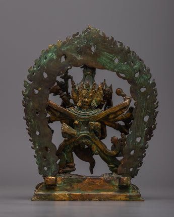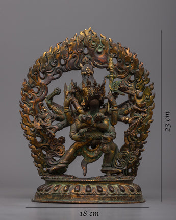 The Chakrasamvara and Consort Vajravarahi Statue is a stunning representation of tantric Buddhist symbolism, beautifully carved from oxidized copper. Standing at 23cm tall, this statue depicts the union of Chakrasamvara which represents the merger of wisdom and compassion, method and wisdom in tantric Buddhism.