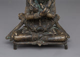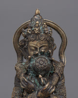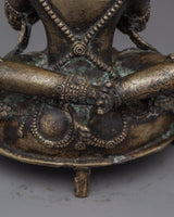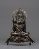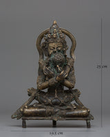 The Chakrasamvara Buddhist Statue is a beautifully sculpted depiction of one of the most important deities in Vajrayana Buddhism. This handcrafted sculpture, made of bronze with an antique finish, has precise craftsmanship and exudes heavenly vitality. The statue shows Chakrasamvara in union with his spouse Vajravarahi, representing Buddhist philosophy's balance of knowledge and compassion. The figure, 25 cm tall and 19.5 cm wide, is inspired by ancient iconography, featuring exquisite jewelry, holy decorations, and significant hand motions. The antique bronze finish adds to its vintage charm, making it a valuable addition to any place dedicated to spiritual practice or art appreciation.
