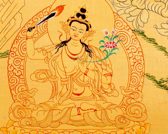 Experience the wonder of a Hand-Painted Thangka, a captivating work of art that blends exquisite craftsmanship with spiritual symbolism. This traditional Tibetan art form, painstakingly created by skilled artists, features intricate details and vibrant colors that capture the essence of Buddhist teachings and iconography. Each brushstroke tells a story, depicting deities, mandalas, and sacred symbols with utmost care and precision. The result is a masterpiece that delights the senses and inspires contemplation and spiritual growth. Whether you're a practitioner of Buddhism or simply an art enthusiast, owning a Hand-Painted Thangka is a meaningful and profound way to connect with a rich cultural heritage and bring a touch of serenity and beauty to your living space. Every Thangka is a unique creation, a testament to the artist's skill, patience, and dedication.