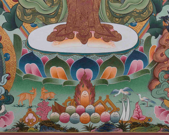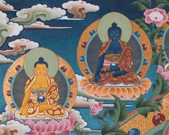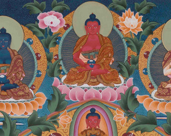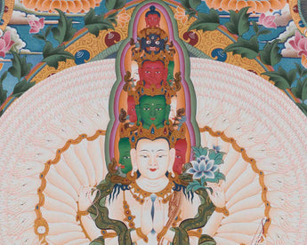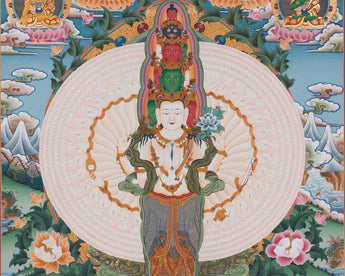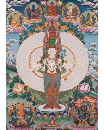 Our thangka, featuring 1000 Armed Chengrezig, Five Buddhas, Manjushri, and Vajrapani, is a spiritually stunning decorative piece that brings blessings of compassion, wisdom, and power into your home.