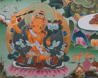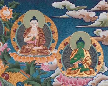 Portraits of the Thousand-Armed Chengrezig are encircled by the Five Buddhas, Manjushri, and Vajrapani are found in thangkas, which are effective meditation aids that direct practitioners toward enlightenment, wisdom, and compassion. Such Thangkas are attractive to the eye and have great spiritual significance in Tibetan Buddhist traditions due to their detailed craftsmanship, vivid colors, and symbolism.