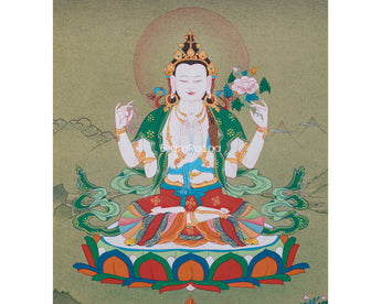 Chenrezig (Avalokiteshvara), symbolizing endless compassion, is depicted with gentle grace, seated on a lotus throne, wearing a crown and silken ornaments, and holding a wish-fulfilling jewel close to his heart. His radiant aura and peaceful expression convey limitless mercy, with hand gestures that symbolize blessings and devotion. Rendered in Karma Gadri style with vivid landscapes and open skies, this sacred thangka illustrates Chenrezig’s vow to free beings from suffering. It encourages viewers to embody love, kindness, and wisdom. Owning this thangka adds beauty and spiritual depth, serving as a meditative focal point, a channel for blessings, and a reminder of compassion in action.