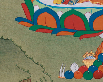 This beautiful 12-inch Chenrezig Buddha Thangka is a genuine work of art, carefully hand-painted on cotton canvas using genuine 24K gold and vibrant acrylic colors. Created in our Enlightenment Studio, it captures the timeless charm of the Karma Gadri tradition, known for its airy compositions, natural backgrounds, and detailed workmanship. Every brushstroke is thoughtfully applied, and the shimmering gold highlights add a divine glow, making this thangka not only stunning to look at but also spiritually significant.
