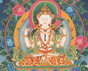 Four-Armed Chenrezig is a bodhisattva who embodies the compassion of all Buddhas. This bodhisattva is variably depicted and described and is portrayed in different cultures as either female or male. But in Tibetan tradition, he generally comes in this four-armed form.