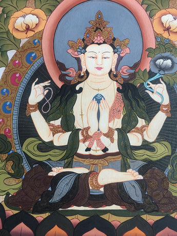 Original Hand painted 4 Armed Chenrezig Bodhisattva Thangka | Hand Painted Buddhist Art