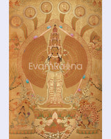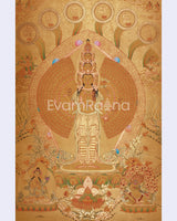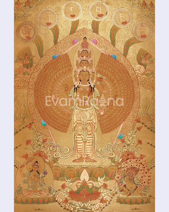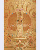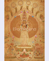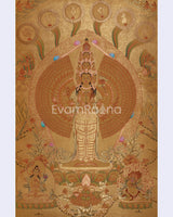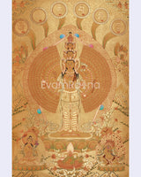 The Avalokiteshvara in Gold Thangka is a stunning spiritual art piece, hand-painted on premium cotton canvas with high-quality acrylic colors and 24K gold accents. Its traditional Tibetan craftsmanship shines through in every detail, giving it a luminous and sacred aura. This thangka is a stunning decorative piece and a powerful tool for meditation and reflection, bringing peace and positive energy to any space.
